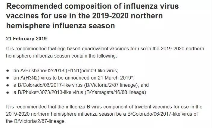 世界衛(wèi)生組織推薦的2019-2020年度北半球季節(jié)性流感疫苗組份信息如下: