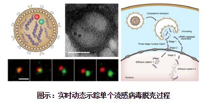 該團隊首先建立了量子點位點特異性標記甲型流感病毒基因組技術。在病毒感染過程中,病毒核糖核蛋白復合物(vRNP)頂端的聚合酶蛋白PA被可控生物素化,與鏈霉親和素修飾的量子點特異性結合,并組裝進入成熟的子代病毒粒子,從而獲得基因組被量子點標記的流感病毒。基于量子點的高亮度和耐光漂白等特點,利用單顆粒示蹤技術,結合病毒包膜和細胞組分熒光標記,對單顆流感病毒感染宿主細胞時的脫殼過程進行實時動態(tài)可視化分析。實時動態(tài)揭示了流感病毒在感染后30-90分鐘,病毒由早期內體進入晚期內體發(fā)生膜融合、基因組與病毒包膜分離、單個節(jié)段基因從晚期內體中分別釋放、解離釋放的單個節(jié)段基因入核、及其在細胞核內運輸?shù)膭討B(tài)過程。發(fā)現(xiàn)流感病毒八個vRNP在脫殼過程中以單獨而非組團的方式從晚期內體中釋放進入細胞質,這些單獨的vRNP以特征性三階段主動運輸機制進入細胞核,入核后的vRNP以兩種不同的擴散模式運輸?shù)狡鋸椭?轉錄位點等重要過程與機制。該研究為世界上首次記錄到單個流感病毒脫殼的實時動態(tài)過程,對深入理解流感病毒在宿主細胞中的生命周期具有重要意義,并將為開發(fā)新的抗病毒途徑提供思路。
